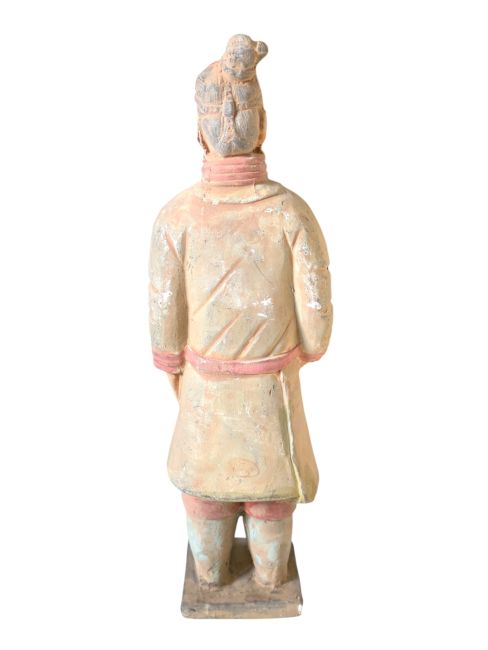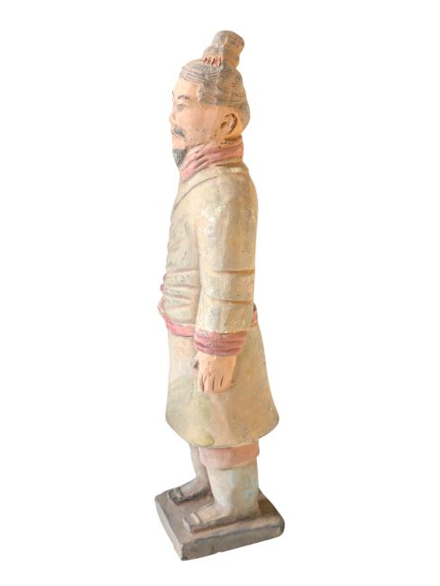 Krieger in Kampfmontur: Diese Statuen repräsentieren eine Kategorie von Soldaten der Terrakotta-Armee. Sie werden üblicherweise als Soldaten in einfacher Kampfmontur dargestellt. Im Vergleich zu anderen Terrakotta-Kriegern sind sie oft weniger ausgerüstet und verziert. Diese Soldaten waren wahrscheinlich einfache Fußsoldaten, die mit Wachdiensten und anderen allgemeinen militärischen Aufgaben betraut waren, und keine höheren Kommandeure oder Angehörige von Spezialeinheiten. Ihre Darstellung spiegelt möglicherweise das typische Bild einfacher Soldaten der alten chinesischen Armee wider: schlichte Kleidung, aber unerschütterlicher Mut und Entschlossenheit.