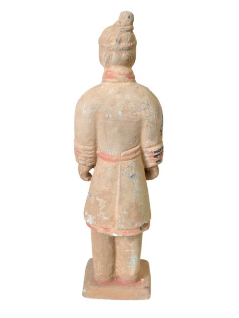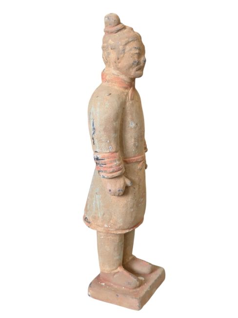 Krieger in Kampfmontur: Diese Statuen repräsentieren eine Kategorie von Soldaten der Terrakotta-Armee. Sie werden üblicherweise als Soldaten in einfacher Kampfmontur dargestellt. Im Vergleich zu anderen Terrakotta-Kriegern sind sie oft weniger ausgerüstet und verziert. Diese Soldaten waren wahrscheinlich einfache Fußsoldaten, die mit Wachdiensten und anderen allgemeinen militärischen Aufgaben betraut waren, und keine höheren Kommandeure oder Angehörige von Spezialeinheiten. Ihre Darstellung spiegelt möglicherweise das typische Bild einfacher Soldaten der alten chinesischen Armee wider: schlichte Kleidung, aber unerschütterlicher Mut und Entschlossenheit.