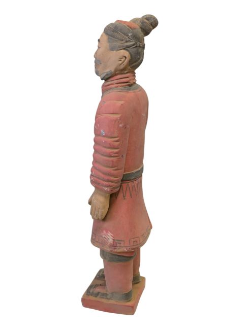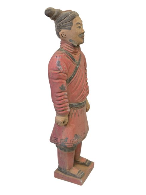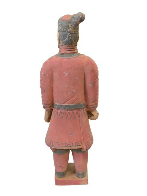Krieger in Kampfmontur: Diese Statuen repräsentieren eine Kategorie von Soldaten der Terrakotta-Armee. Sie werden üblicherweise als Soldaten in einfacher Kampfmontur dargestellt. Im Vergleich zu anderen Terrakotta-Kriegern sind sie oft weniger ausgerüstet und verziert. Diese Soldaten waren wahrscheinlich einfache Fußsoldaten, die mit Wachdiensten und anderen allgemeinen militärischen Aufgaben betraut waren, und keine höheren Kommandeure oder Angehörige von Spezialeinheiten. Ihre Darstellung spiegelt möglicherweise das typische Bild einfacher Soldaten der alten chinesischen Armee wider: schlichte Kleidung, aber unerschütterlicher Mut und Entschlossenheit.