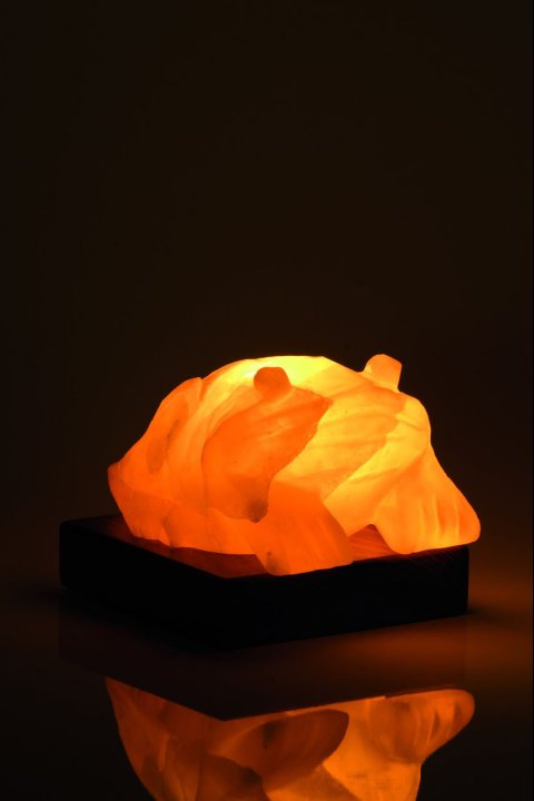 Natürliche Salzlampe mit Holzsockel.