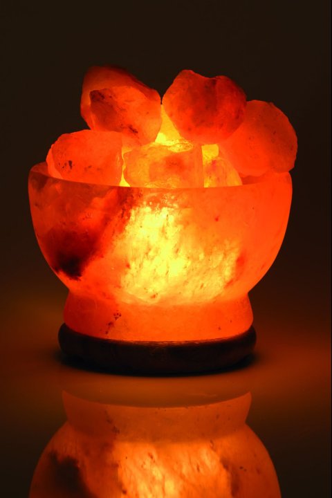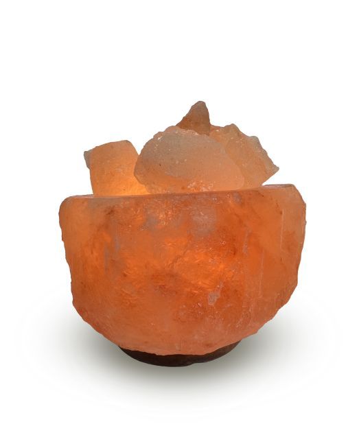 Natürliche Salzlampe mit Holzsockel. Kristallschale in Form einer Schale für Salzkristalle, mit einer Glühbirne am Boden für ein sanftes, diffuses Licht.