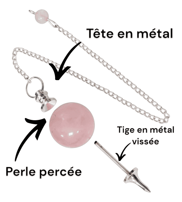 Die Perle und das Pendel, beide aus demselben Naturstein geschliffen, verfügen über eine zentrale Bohrung zum Einsetzen und Einschrauben eines Metallstabs, was für Stabilität und Haltbarkeit sorgt.